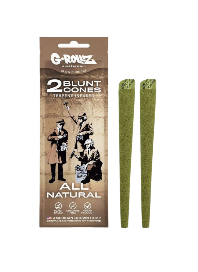 Cada pacote contém 2 cones de blunt king size com infusão de terpeno sabor natural e uma peça em bambu para calcar. Esses cones de blunt são feitos de flores cultivadas nos EUA de alta qualidade e infundidos com terpenos naturais, para dar mais sabor e a