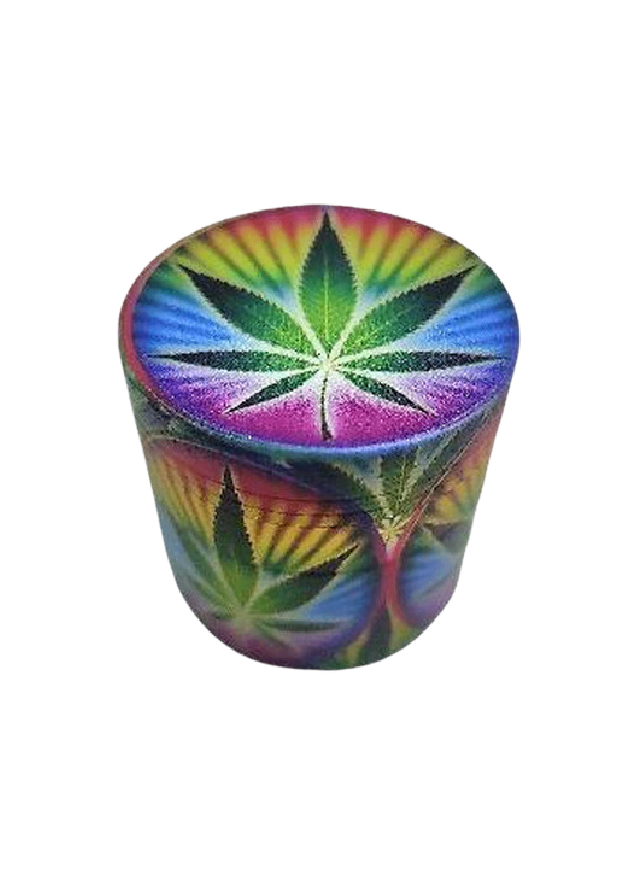 Grinder de metal com folha grande e fundo de arco-iris. Possui fecho magnético e é dividido em 4 partes com uma rede para separar os póllens e um reservatório. Diâmetro: 40mm Altura: 40mm