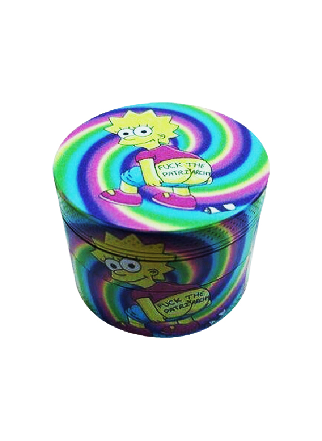 Grinder de metal da Lisa Simpson contra o patriarcado. Com fundo arco-iris. Possui fecho magnético e é dividido em 4 partes com uma rede para separar os póllens e um reservatório. Diâmetro: 50mm Altura: 40mm