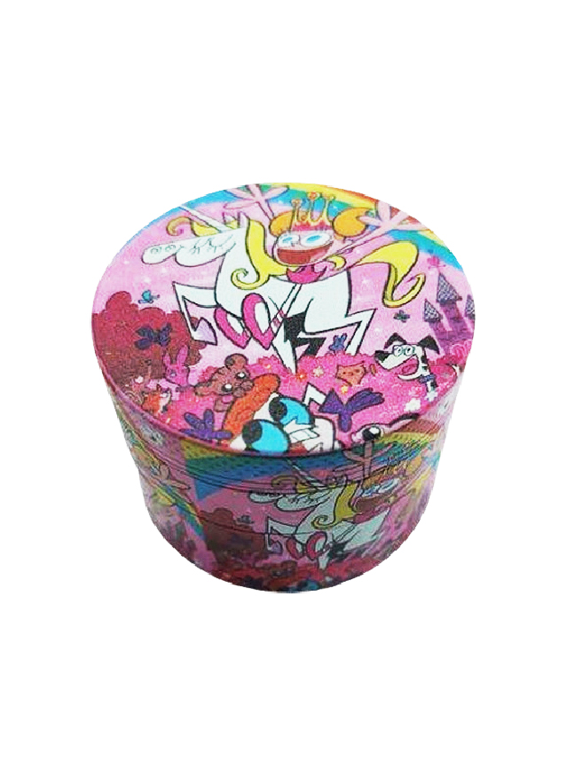 Grinder de metal da Princess e Unicorn. Com fundo rosa. Possui fecho magnético e é dividido em 4 partes com uma rede para separar os póllens e um reservatório. Diâmetro: 50mm Altura: 40mm