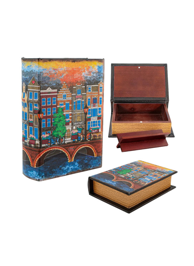 Caixa de madeira em formato de livro para armazenar e guardar acessórios. Inclui uma peça em madeira para rolamento. Ideal para manteres a discrição quando receberes visitas na tua casa. Disponível nas dimensões: 18cm x 13cm x 5cm