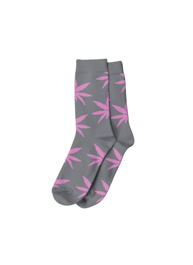 Meia de cannabis longa na cor cinza com folhas rosas. Vendido ao par. Tamanho 36-42
