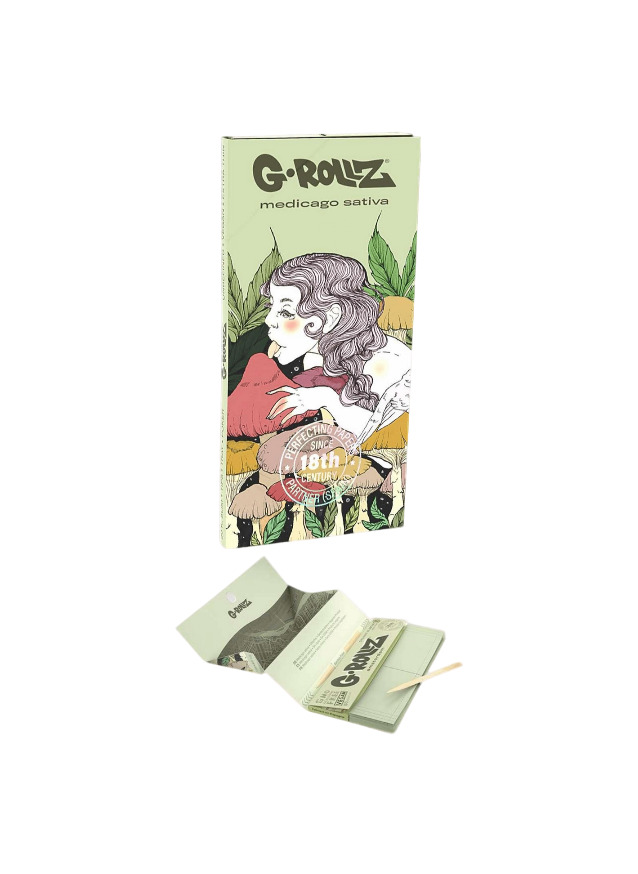 Cada caixa tem 50 folhas king-size de cânhamo orgânico, levemente tingidas na cor verde, junto com 50 pontas de filtro verde, uma peça de bambu para calcar e uma sopeira dobrável.